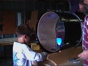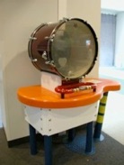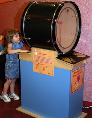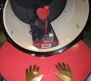 Listen To Your Heart senses the tiny electrical signals of each pulse of the heart using brass hand prints. The filtered and amplified signals are used to beat a large drum and flash a red light in exact sync with the user’s heartbeat. This exhibit is offered in both single and double sided standard models, with a 22” diameter drum. These are designed to be mounted to a base supplied by the customer. We can also provide a base, if required, as well as other sizes and styles of drum, as custom items.